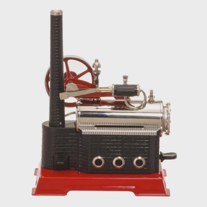 Wilesco D 14 steam engine with mirror polished and nickel-plated boiler, diameter 2.25 in, length 5.0 in, boiler capacity 15 in, with water gauge glass. Boiler house true to life, colored and copper plated, with embossed brick type walls, 2 footbridges. Double action reversible brass cylinder with flywheel, spring loaded safety valve, dome whistle, flywheel of 3.25 in diameter with grooved pulley, steam jet oiler. All condensed water is collected in a gathering tray below the smokestack and the chimney smokes just like the original. Finely painted metal base plate 5.0 in x 9.0 in. Height including smokestack, 10.5 in, Weight: 2 lbs. (Esbit is not included) Unique Gifts for Men