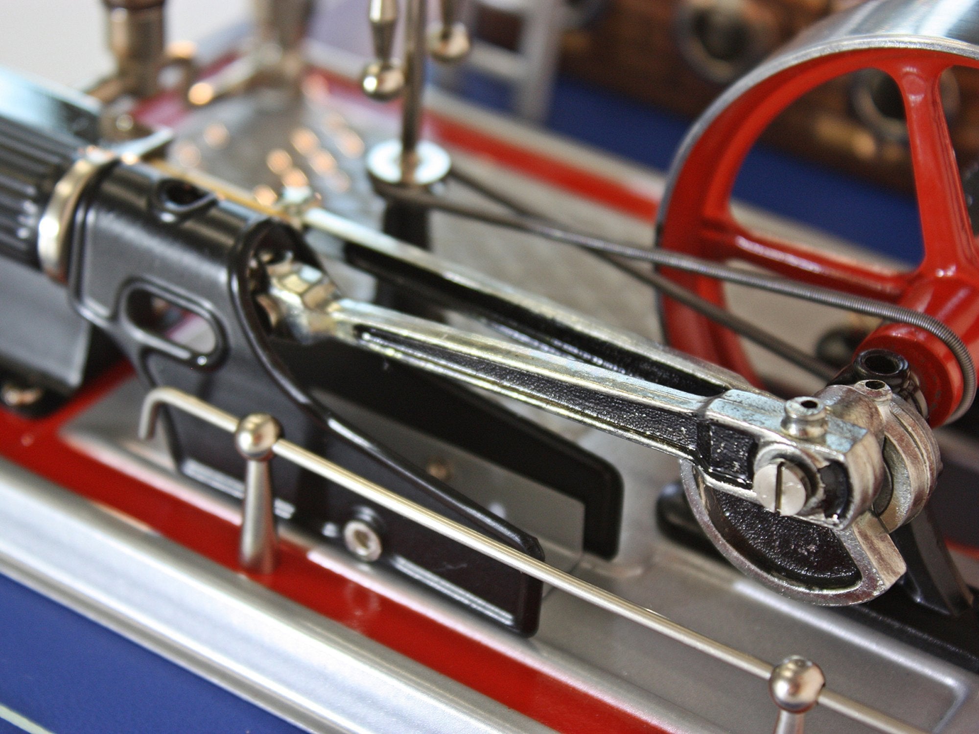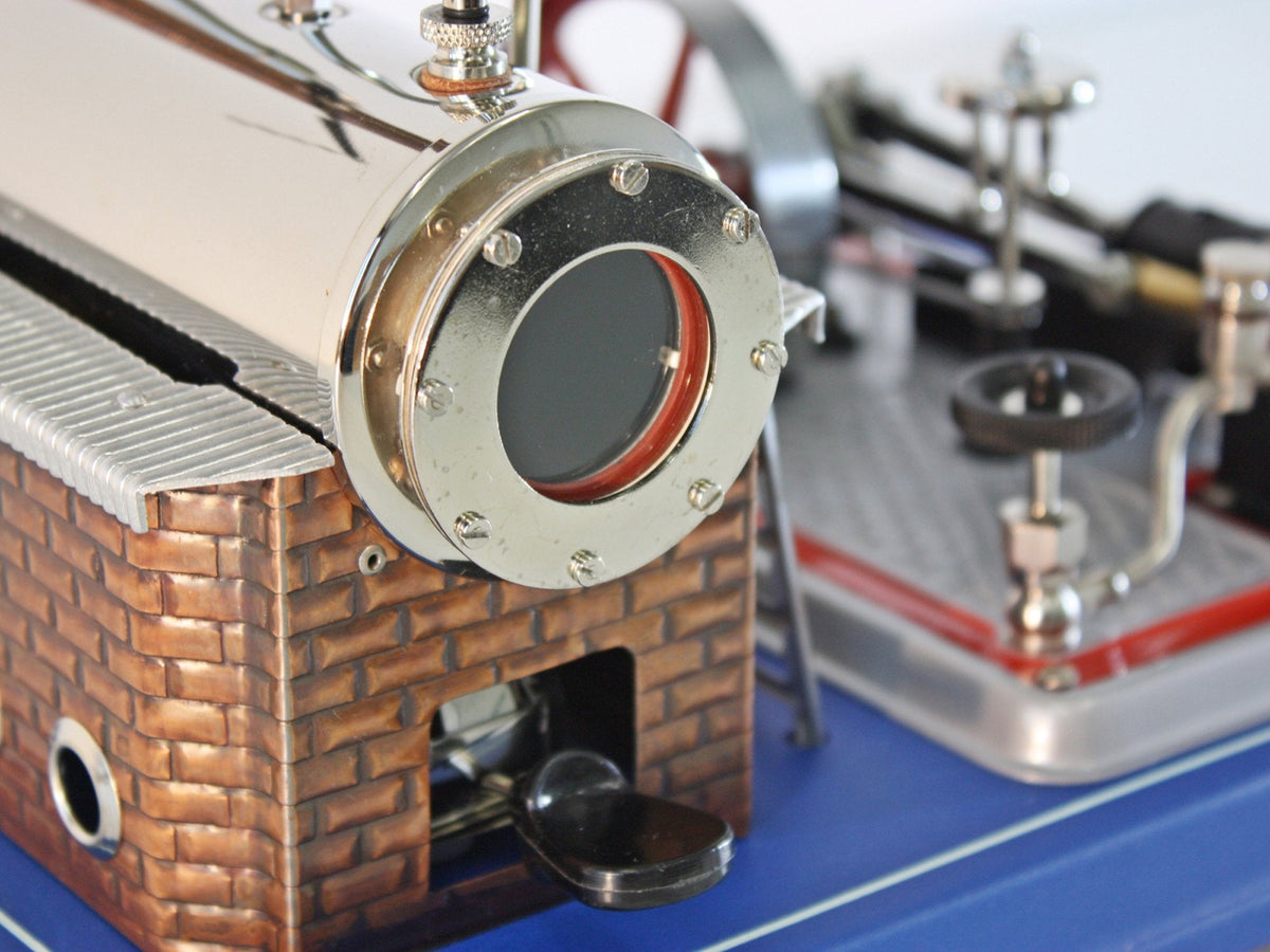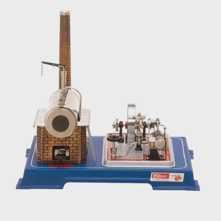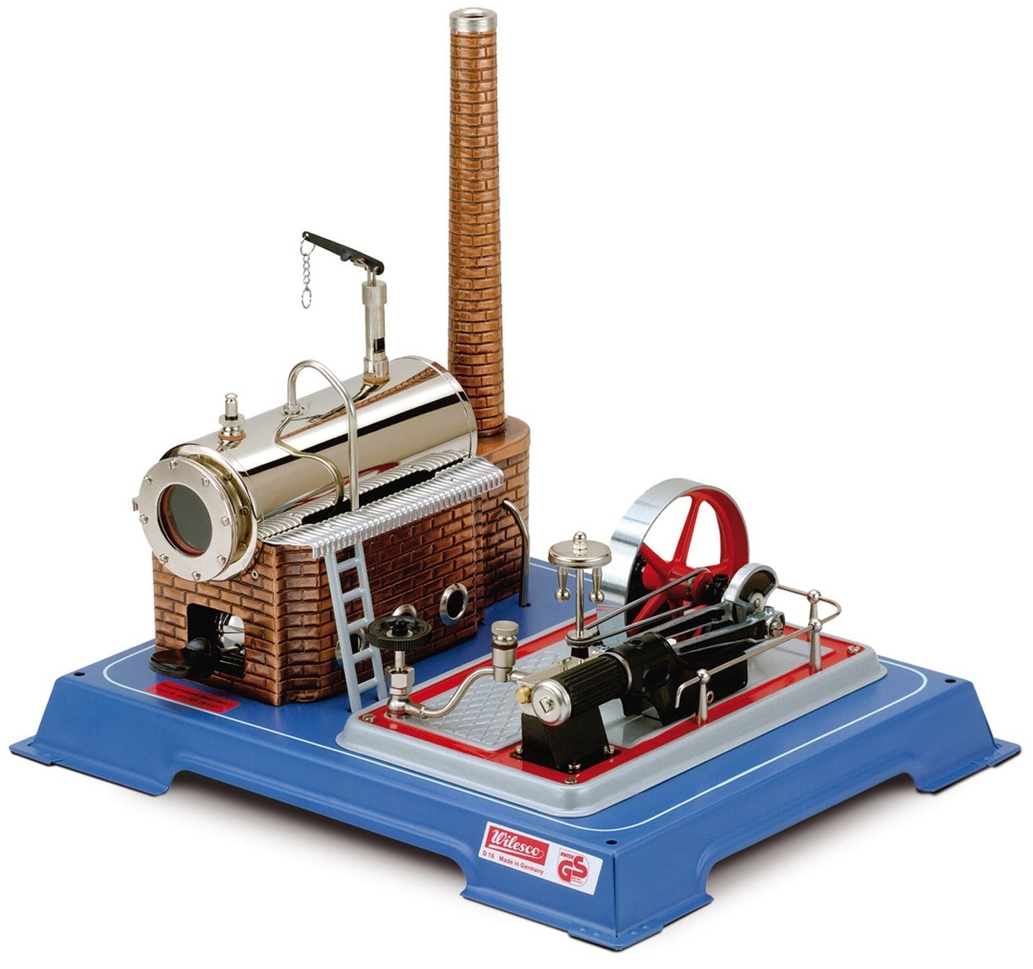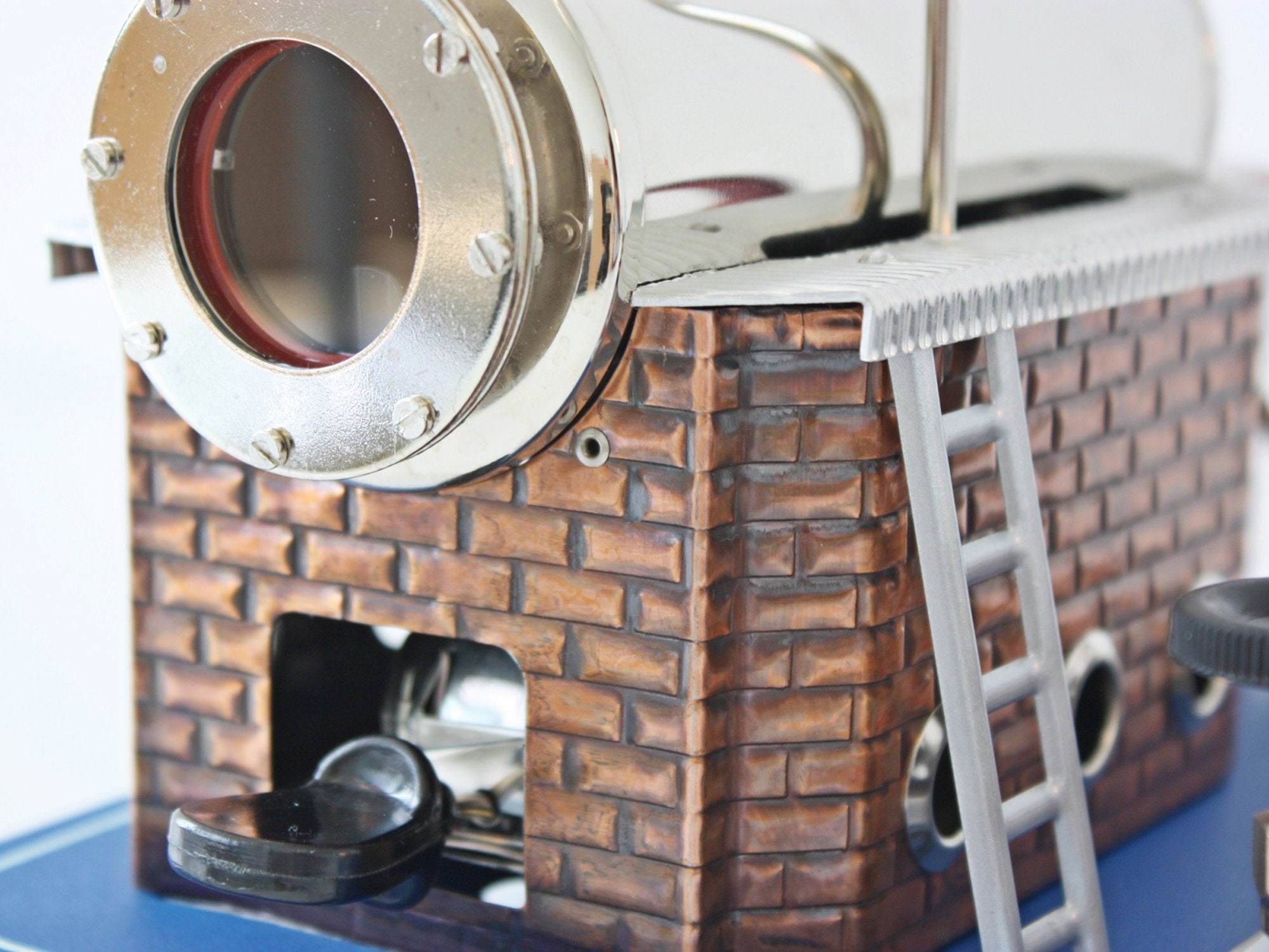 Wilesco D 16 steam engine with mirror polished and nickel plated boiler, diameter 2.25 in, length 5.5 in, boiler capacity 15 in, with water gauge glass. Boiler house with embossed brick type walls, 2 footbridges with ladder. Double action reversible brass cylinder with flywheel, spring loaded safety valve, additional steam whistle with chain, steam regulator, flywheel of 3.25 in diameter with grooved pulley, sturdy attractive die cast piston rods, centrifugal governor, steam jet oiler and railing. The condensed water is fed to a tank, hidden behind the boiler house, causing the chimney to smoke realistically. Finely painted metal base plate 9.75 in x 12.25 in. Height, including smokestack, 11.0 in, Weight: 3 lbs. 10oz. Unique Gifts for Men