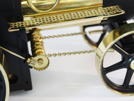 The tractor can move forward and backward, powered by a flywheel that can be started in either direction. The boiler has a diameter of 45mm and a length of 185mm and can hold 230 cubic centimeters. The brass boiler has been polished to a high shine and nickel-plated. The accompanying water level gauge is designed as a glass display, inviting you to take a close look at the steam engine's operation. The tractor has chain steering and a transmission clutch. The mobile steam engine can also be used as a stationary engine, thanks to the disengage able gear drive. The running time is about 15 minutes with a full load of our dry fuel, Witabs.